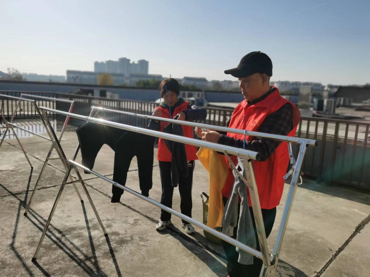 交汇点讯 初冬的早晨,阳光和煦。12月1日,在兴化市昭阳街道长安社区党群服务中心二楼“爱心洗衣坊”内,兴化市爱心公益协会会长万再英将一件件脏被套、棉衣放进洗衣机里清洗。出了“爱心洗衣坊”,东侧就是一个露天平台,4个晾衣架整齐排列。“天气不错,下午就可以晒干。”协会志愿者马更生、解忠林端着装满衣物的盆子,一件件晾晒。
