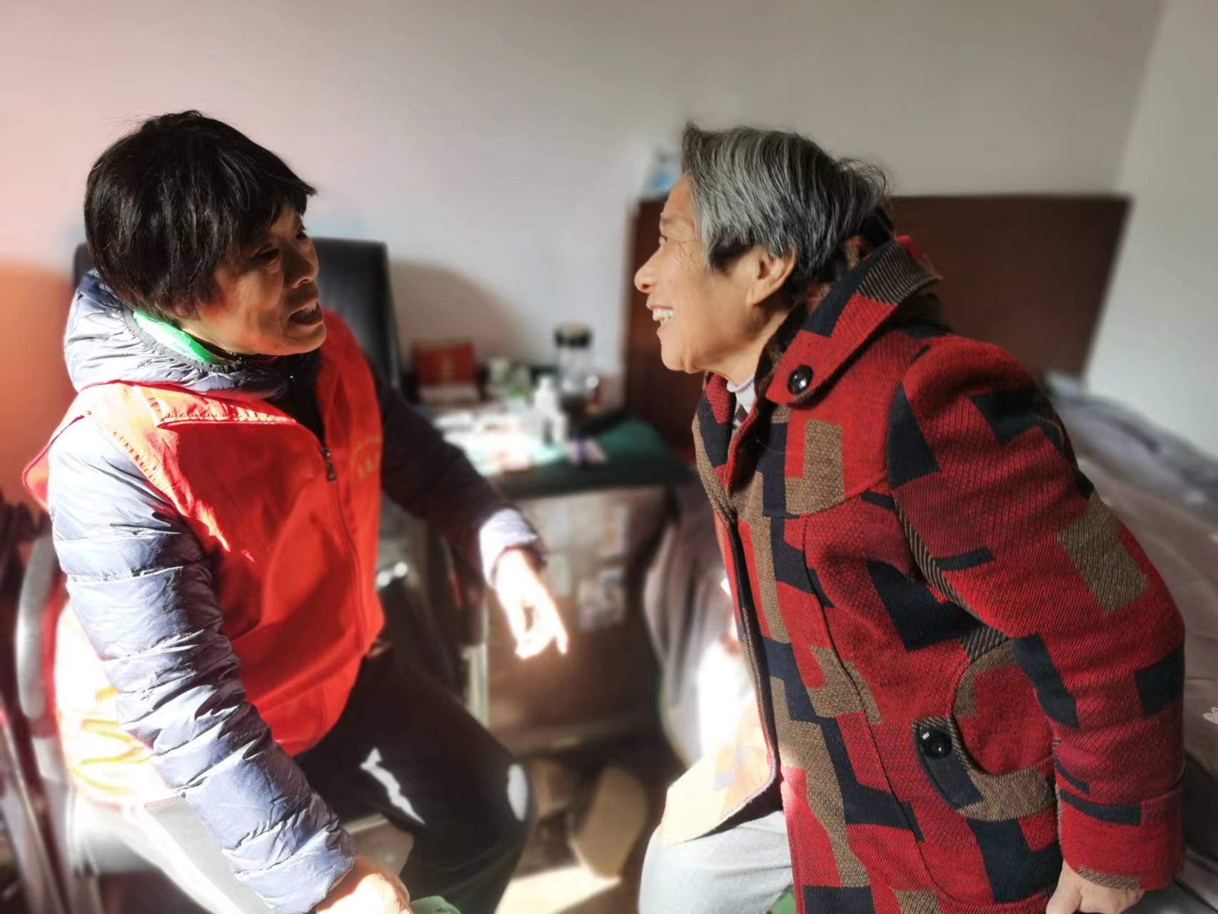 跟着志愿者解忠林,记者穿过弯弯曲曲的小巷,来到了74岁徐孝兰奶奶的住处。徐孝兰常年独居,因中风多年,走路需要拄着拐杖。“上次看到她用得被套都坏了,这次特地带了新的过来。”走到徐孝兰的床前,解忠林麻利地换上新被套,陪老人聊起家常。