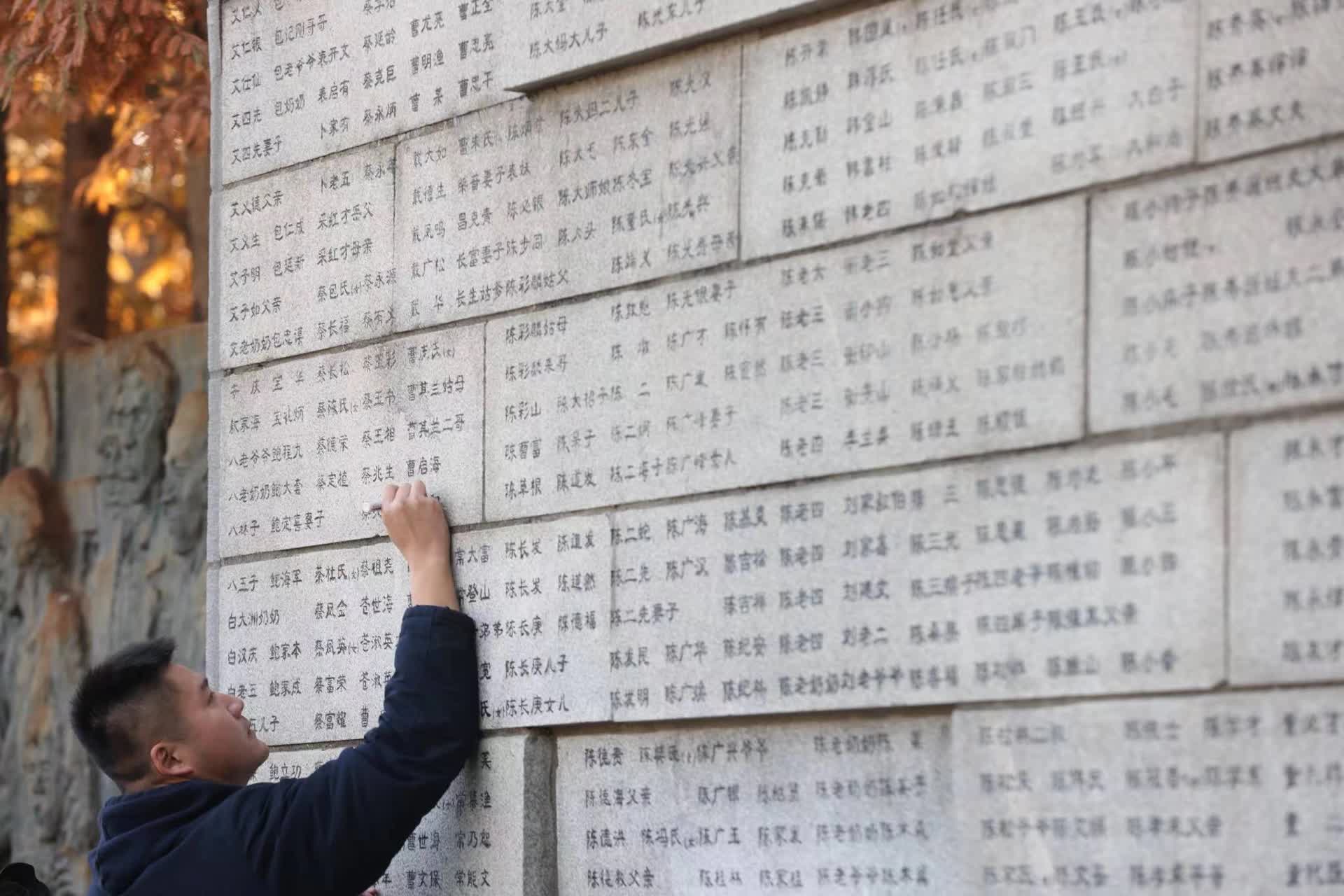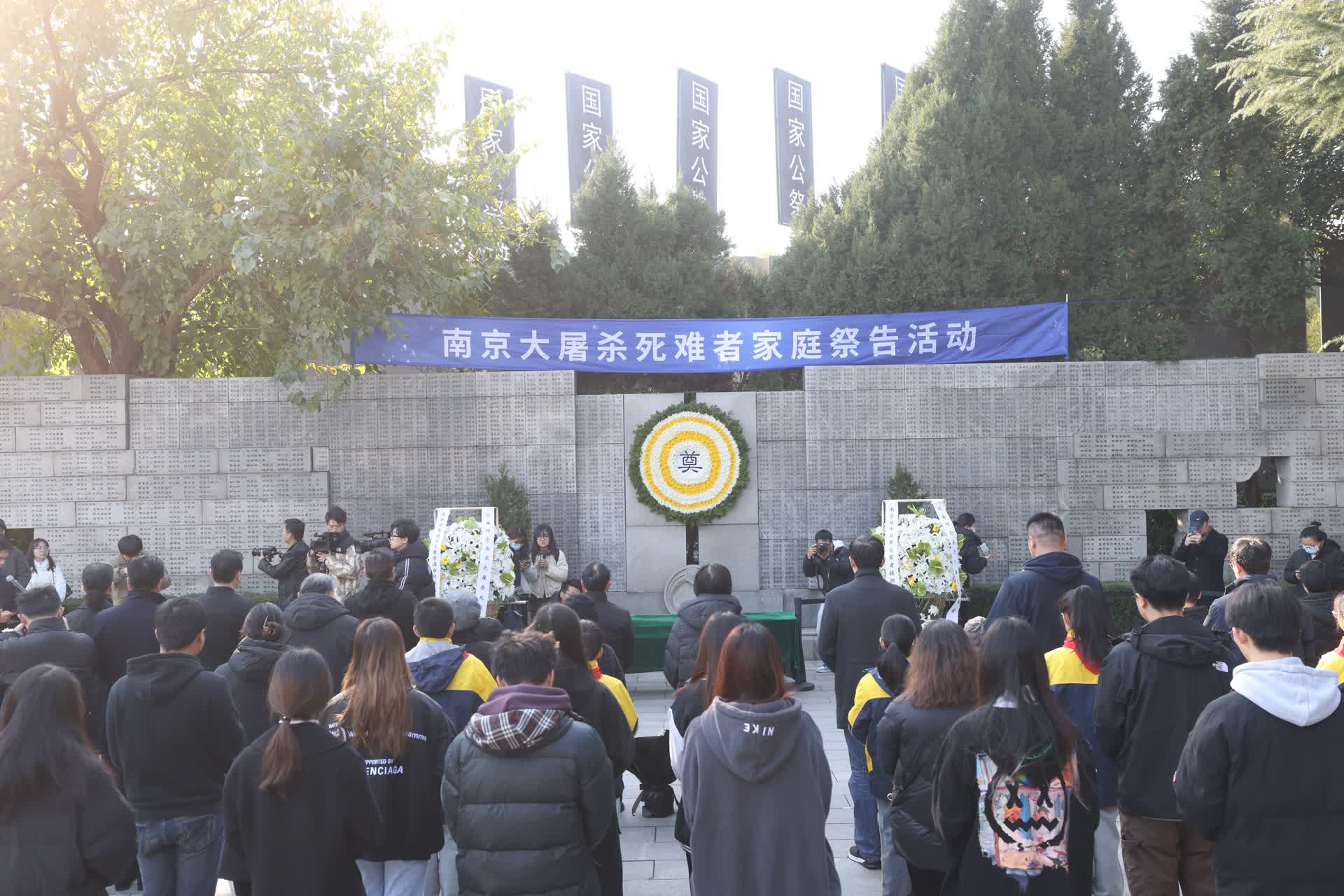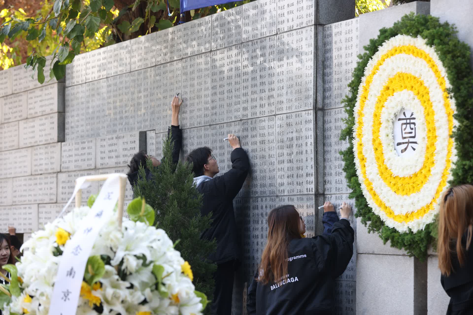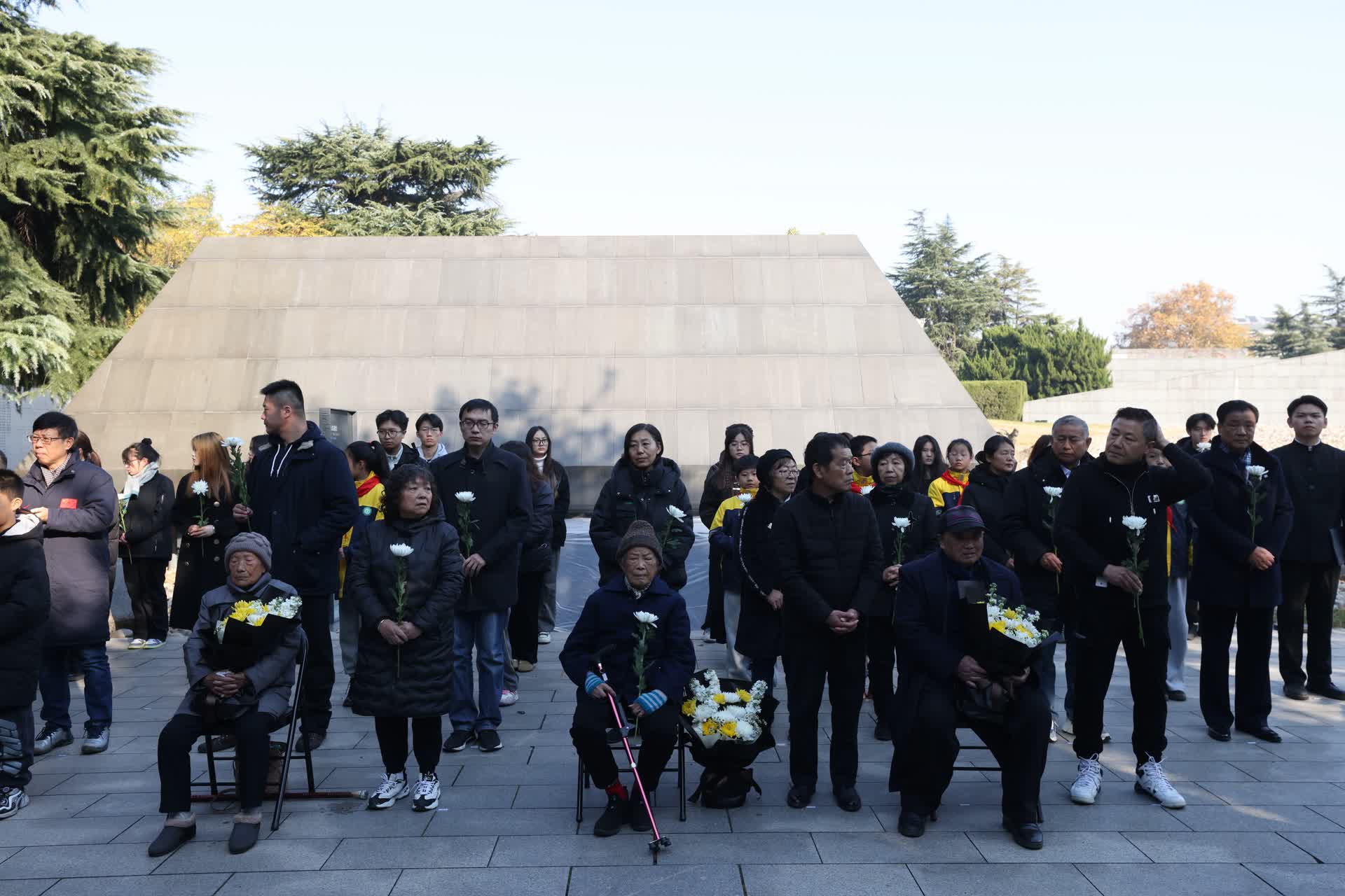 天气寒冷,全体人员手持菊花向南京大屠杀死难者鞠躬。侵华日军南京大屠杀遇难同胞纪念馆南京大屠杀死难者名单墙上镌刻着很多姓名,一横一竖、一撇一捺,诉说着千千万万个家庭沉重的过往,镌刻着中华民族不能忘却的记忆。