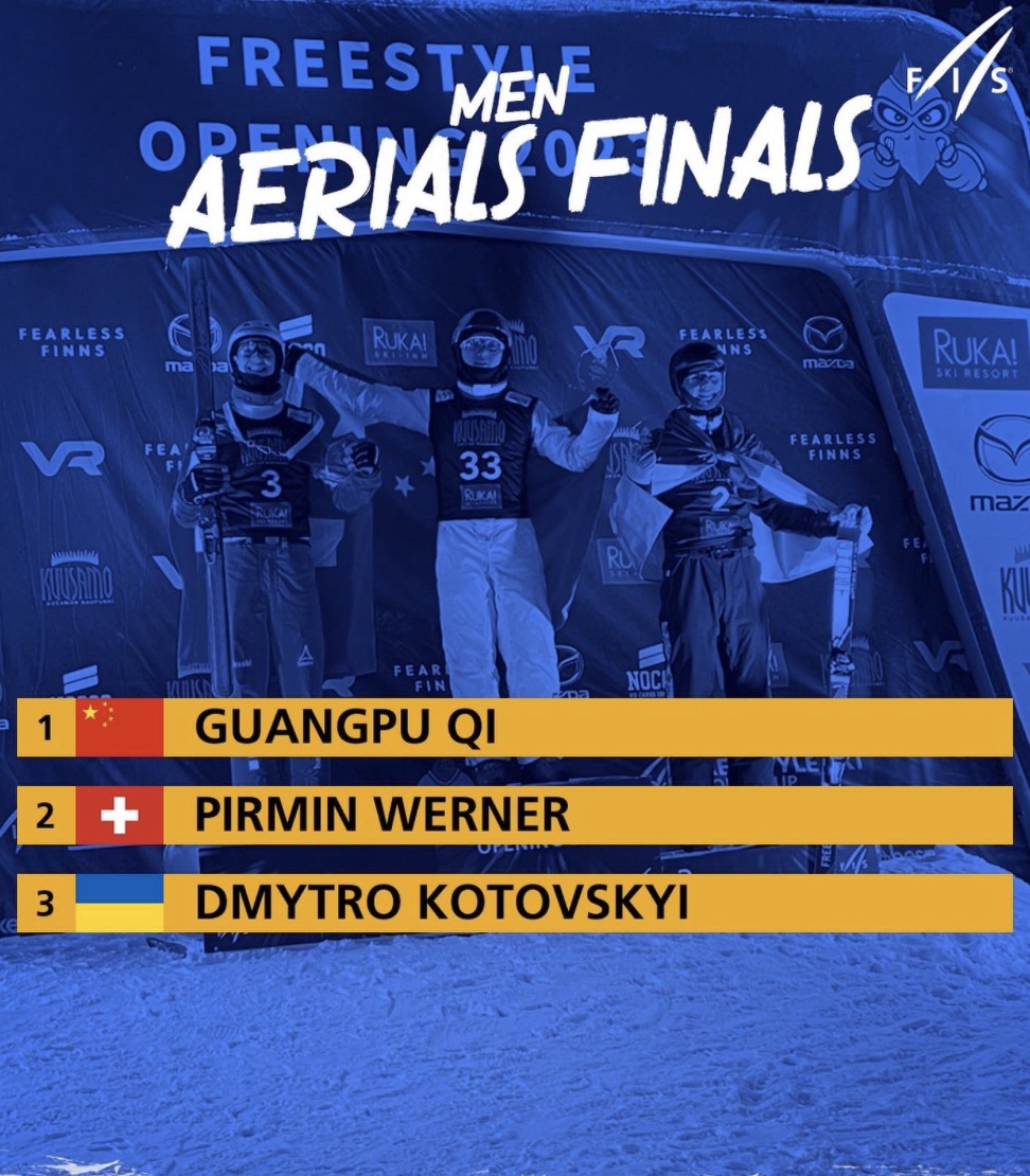 当地时间12月3日,2023-2024赛季国际雪联自由式滑雪世界杯赛季首站在芬兰卢卡开赛。在男子空中技巧决赛中,中国选手、冬奥冠军齐广璞用一枚金牌宣告自己的强势回归。瑞士队选手皮尔明·维尔纳、乌克兰队选手德米特罗·科托夫斯基分获银牌和铜牌。此外,中国队选手王心迪获得第五名,杨龙啸位列第七,李天马名列第十。