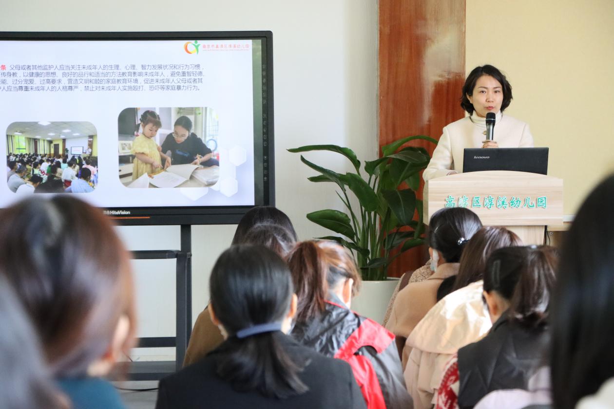 随后,副园长夏英给大班家长进行了《江苏省家庭教育促进条例》专题解读,详细讲解条例内容并介绍了幼儿园落实《江苏省家庭教育促进条例》的工作举措及成效,为家长们进一步做好家庭教育工作起到了积极的推进作用。
