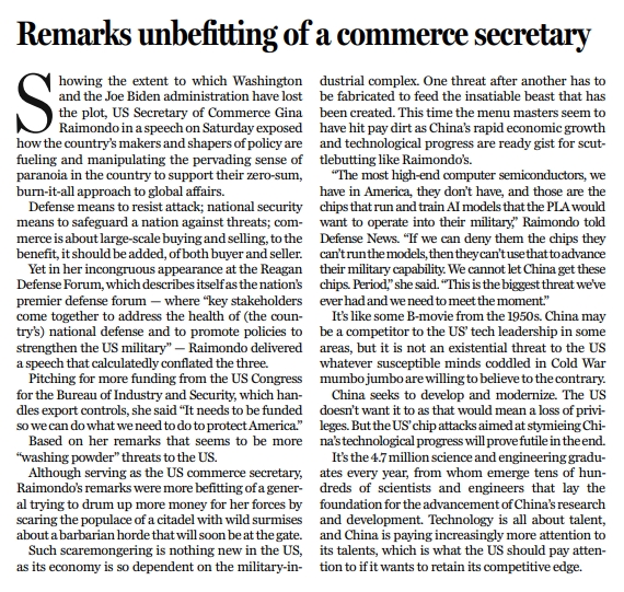 其实,这种肆意散布恐慌情绪的做法,在美国并不是什么新鲜事。美国经济依赖于军工复合体,因此就需要编织一个又一个的安全威胁,来投喂这只由美国一手造就、“永不满足”的怪兽。这一次,“厨艺大师们”似乎又成功了,中国经济的快速发展和技术的进步,刚好给了雷蒙多等人以借口,可以据此大做文章。