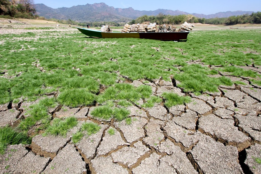 A wooden boat is seen on dry bed of a reservoir in Wonogiri district, Central Java, Indonesia, Aug. 10, 2023. (Str/Xinhua)