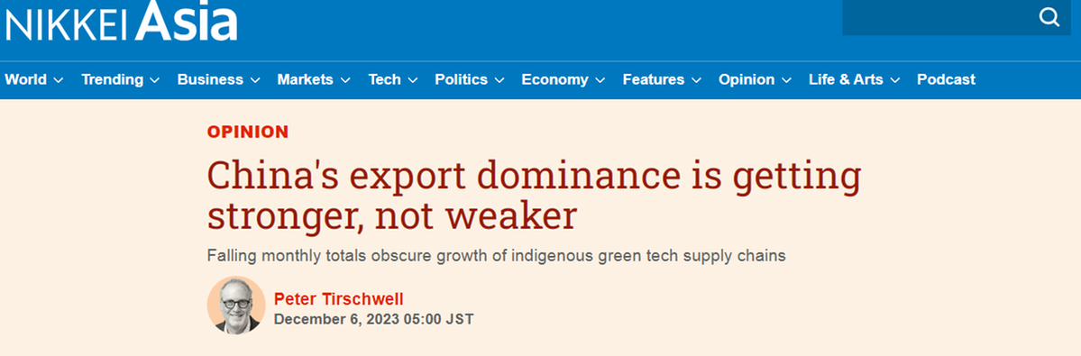 日经新闻网近日刊发标准普尔全球市场财智公司(S&P Global Market Intelligence)副总裁彼得·蒂尔斯韦尔的文章称,得益于中国绿色科技产品的蓬勃发展,中国稳居全球最大货物贸易出口国的地位。