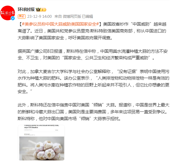 美国政客炒作“中国威胁”越来越离谱了。近日,美国共和党参议员里克·斯科特致信美国商务部,称从中国进口的大蒜影响了美国国家安全,呼吁美国政府展开调查。