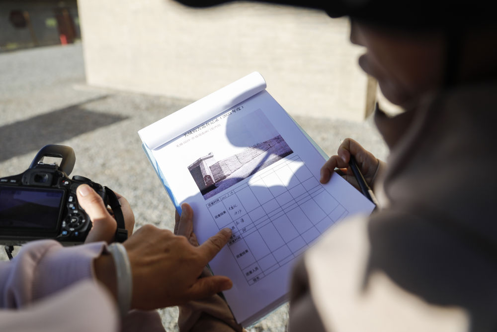 7月14日,嘉峪关丝路(长城)文化研究院文化遗产监测中心副研究馆员柳君君(左)和同事在甘肃嘉峪关关城景区记录巡查数据。