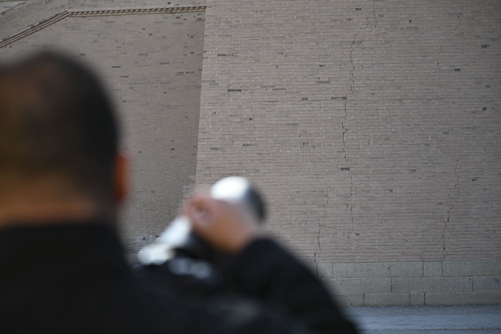 7月14日,嘉峪关丝路(长城)文化研究院文化遗产监测中心工程师高商在甘肃嘉峪关关城景区使用远距离裂缝测宽仪监测关城城墙上裂隙的变化情况。