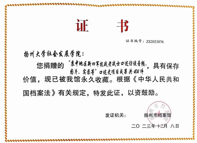 据悉,2014年以来,扬州大学“铁血夕阳红——抗战老兵口述史”公益团队的志愿者们充分发挥历史学、档案学等专业优势,通过公益接力的形式,走遍全国10余个省份,寻访了230余位抗战老兵,采录了600余份视频、图片、文档材料,挖掘抢救抗日史料。去年暑假期间,志愿者们在走访老兵的过程中,从扬州市文史馆特聘研究员朱德林处了解到《江都县治安调查报道》的存在。得到材料后,曾在日本留学多年扬州大学历史系教授唐剑明带领学生对这份史料进行翻译,并结合历史资料进行初步校核。此次捐赠给扬州市档案馆的史料档案还包含404份抗战老兵口述资料和40万字志愿者们的采访实录。