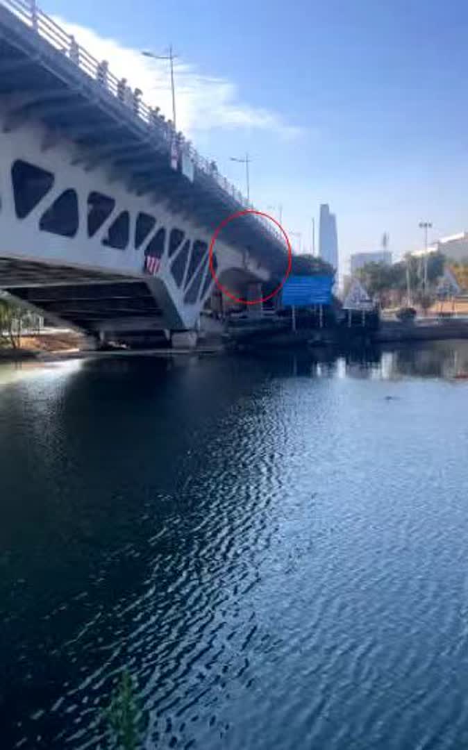 事发当天中午12点多,一名年轻女子在宝带东路桥附近不慎失足掉进运河中,由于天气寒冷,加上河水湍急,不一会,女子的体力就消耗殆尽,身体也一点点往下沉。听到呼救声后,桥上一名小伙立即脱下裤子和外套,纵身一跃跳下近20米高的宝带东路桥,一头扎进冰冷的河水中。这一跳,着实让现场的目击者为他捏一把汗。