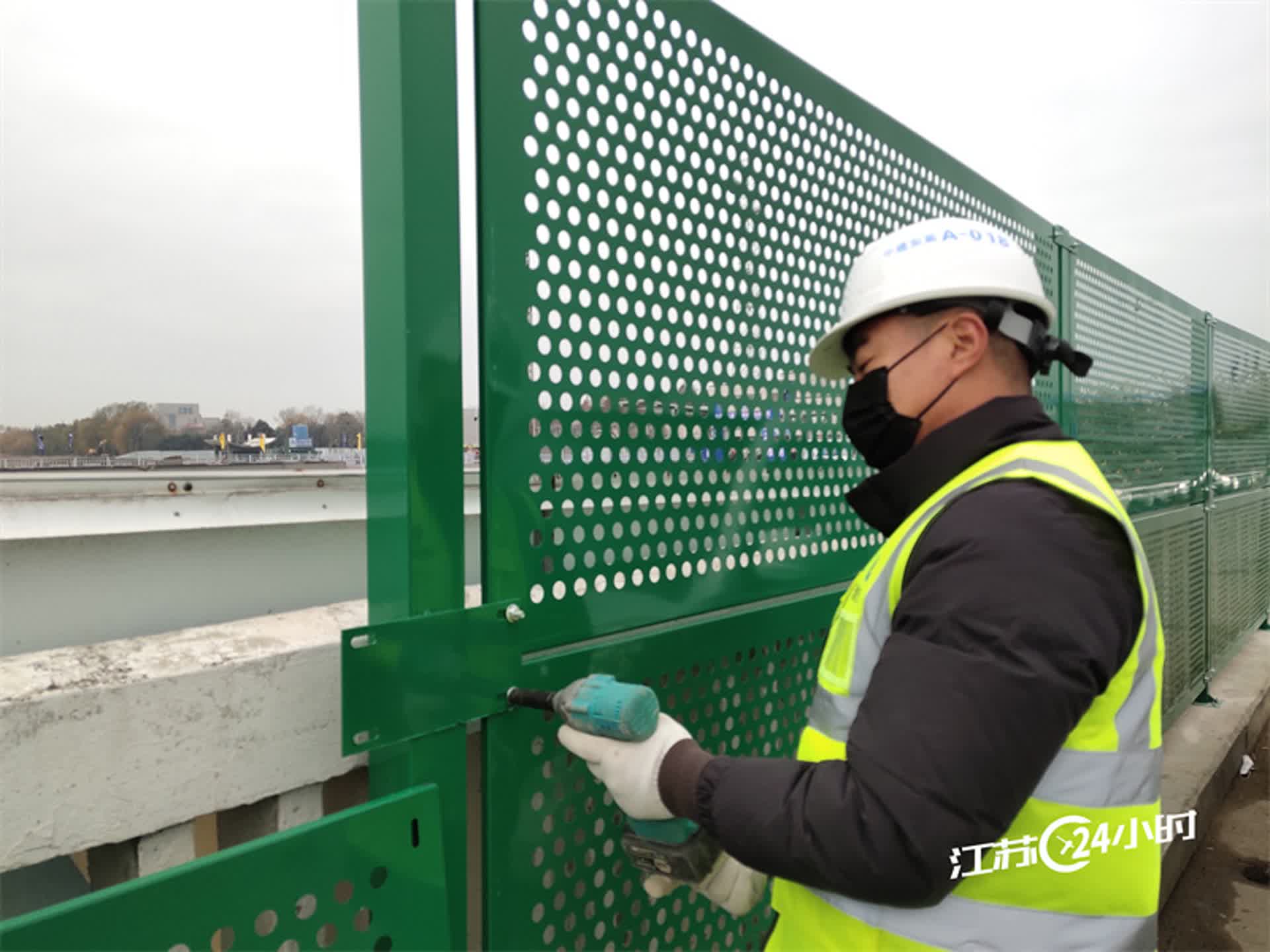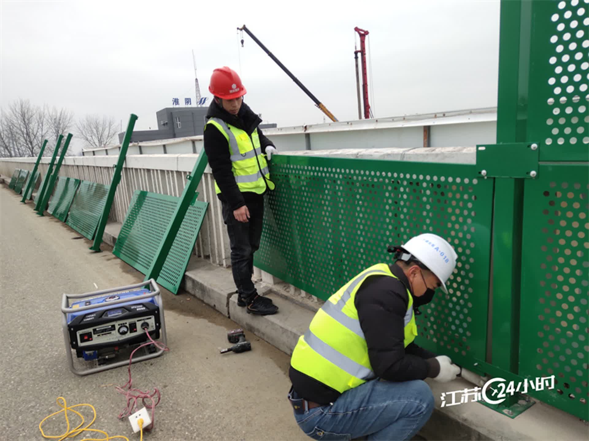 (特约摄影 张德春 8:26摄 9:00上线)12月13日,淮安市淮安区,工作人员正在运东复线桥安装防护网,保障市民出行安全。