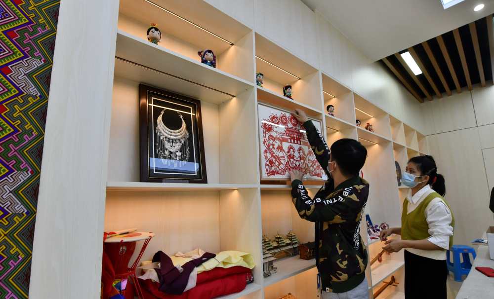 近日,在社区党群服务中心,工作人员在展示少数民族手工艺品。新华社记者 黄孝邦 摄