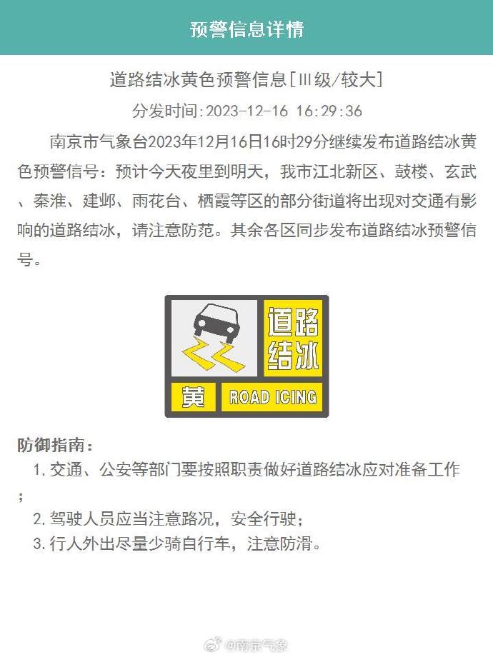 南京市气象台2023年12月16日16时29分继续发布道路结冰黄色预警信号:预计今天夜里到明天,我市江北新区、鼓楼、玄武、秦淮、建邺、雨花台、栖霞等区的部分街道将出现对交通有影响的道路结冰,请注意防范。其余各区同步发布道路结冰预警信号。