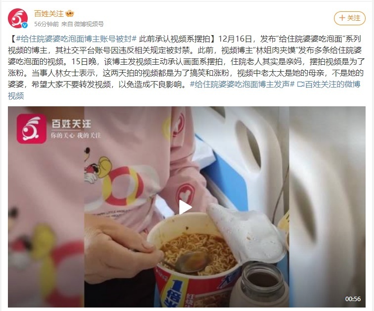 12月16日,据媒体报道,此前发布“给住院婆婆吃泡面”系列视频的博主,其社交平台账号因违反相关规定被封禁。