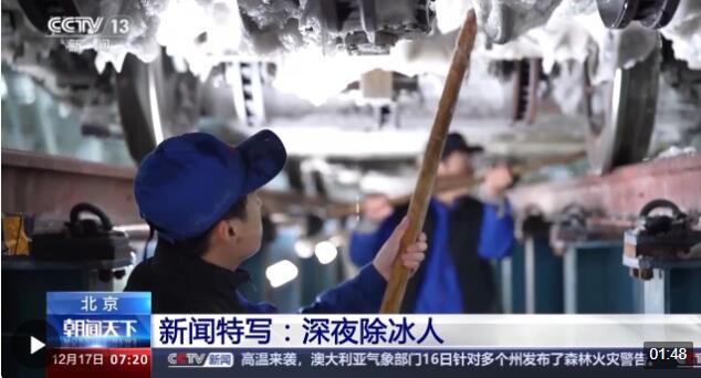 北京动车段北京南动车运用所一级修车间值班主任 王昌雷:线上对动车组的运行状态有一个TEDS检测系统,如果有冰覆盖,是看不见动车具体的机械部件,所以入库以后,一定要先把冰除掉。