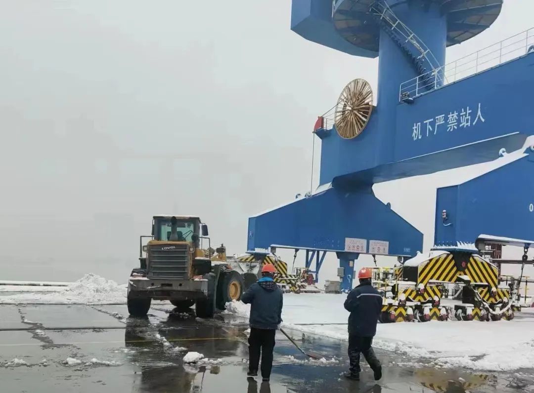 工作人员利用高压水枪清理厂区棚顶积雪,消除安全隐患。在南京港江北集装箱码头,工作人员不惧风雪,清理主要生产路线,全力以赴保通保畅。