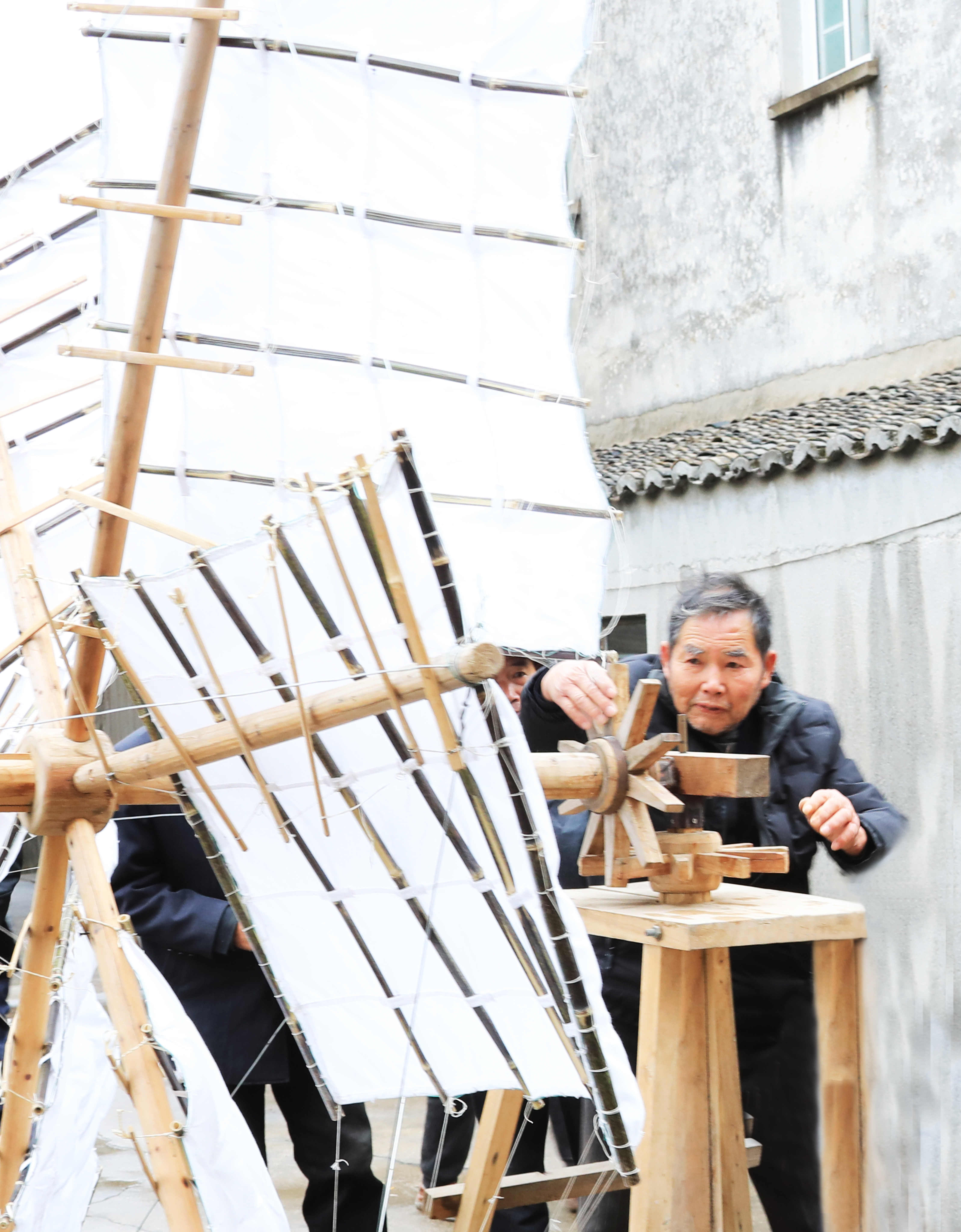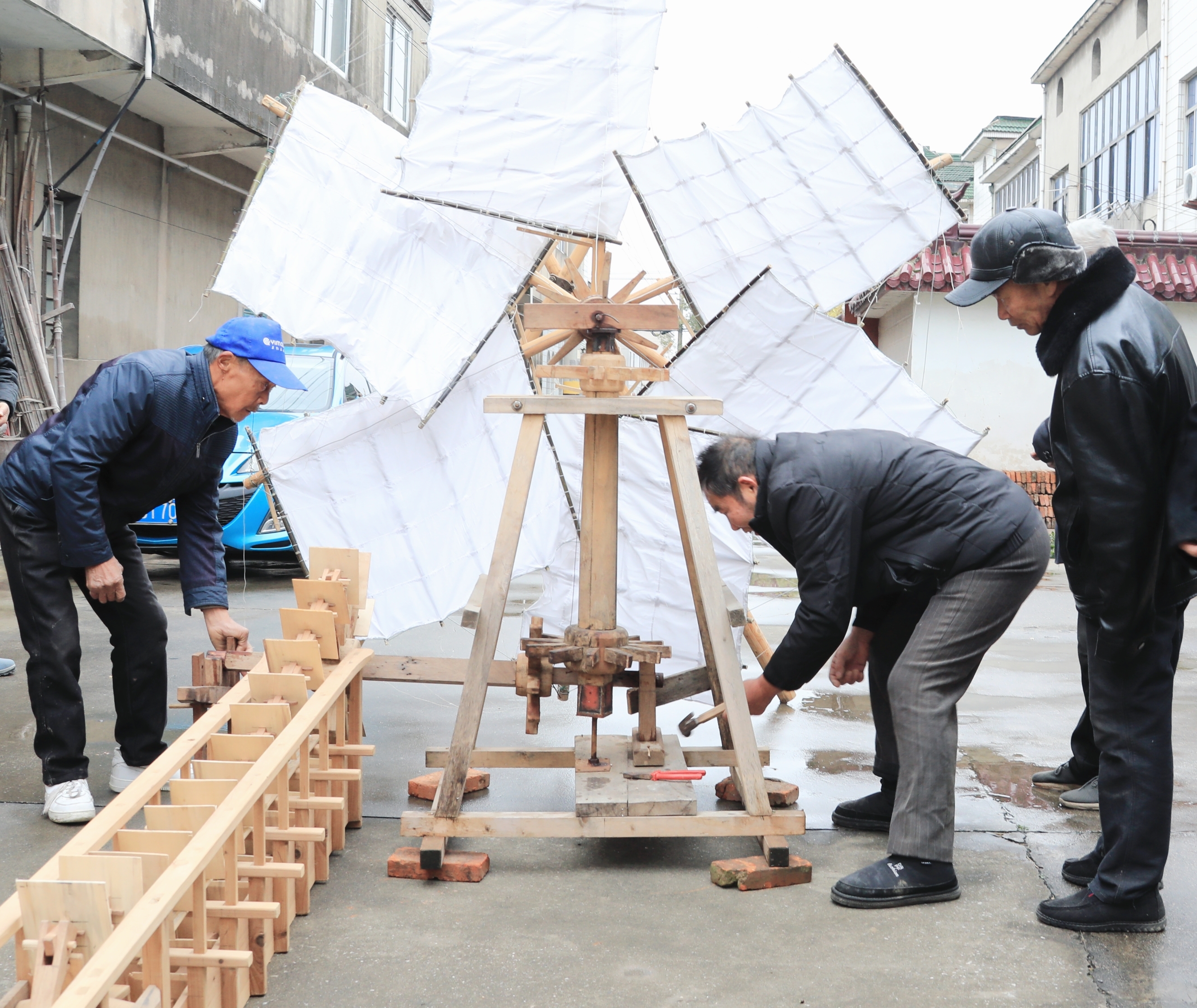 那天,村里的人知道他调试风车,都来看热闹。几个七八十岁的人更是起劲,帮着搬帮着装。他们比画着说:过去用的风车有一楼一底那么高,远远看见六面白布扇迎风旋转,很是壮观。戴师傅制作的缩小版风车,结构符合我们印象中的样子,现在少见有人会造了。了不起!
