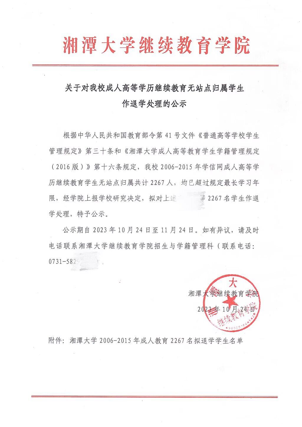 记者了解到,湘潭大学继续教育学院于今年10月份发布一份公示,对2267名学生作退学处理。