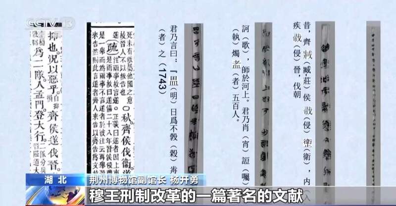 荆州博物馆副馆长 杨开勇:首次发现了基本完整的《尚书·吕刑》,这是一篇记述西周时候穆王刑制改革的一篇著名的文献,它的内容现在跟传世本的《今文尚书》里面的基本一致。对校勘传世本以及研究这篇著名的文献,在战国时候的文本传抄和思想影响具有重要的意义。还有一方面就是发现了最早的乘法口诀的实物叫《九九术》。简文是说五七三十又五,四七二十又八,三七二十又一,这个之前所知的最早的乘法口诀是湖南里耶秦简里面的,这一次发现比里耶秦简还早一个多世纪。