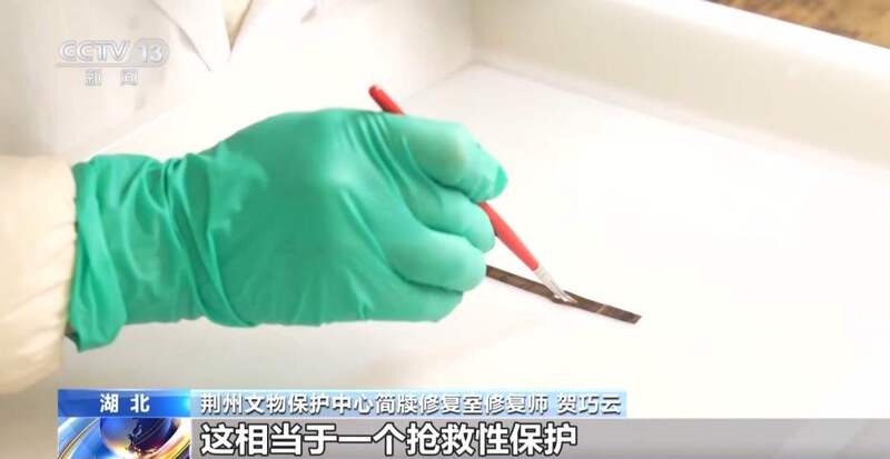 荆州文物保护中心简牍修复室修复师 贺巧云:竹简是整体打包到我们修复室,它是一根叠着一根的,泥土压得比较紧,它的文字提取和清洗工作难度都很大,我们都是轻轻地蘸一下,点一下,轻轻地洗下来的。截取出来之后做红外扫描,这相当于一个抢救性的保护,把它信息提取出来。