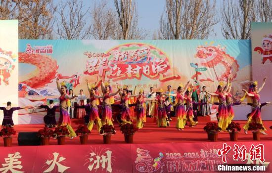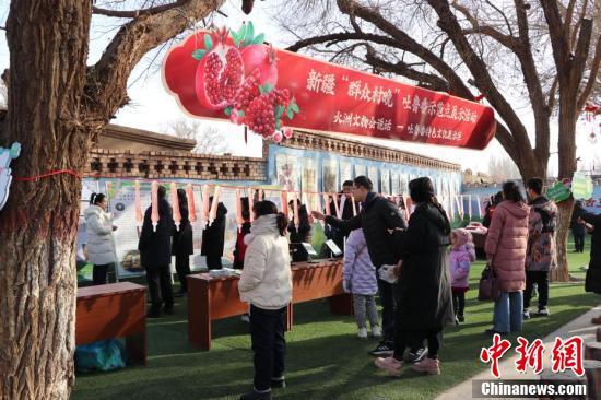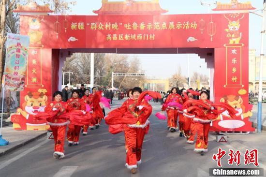 12月23日,新疆吐鲁番市高昌区新城片区新城西门村,和美火洲·欢乐乡村吐鲁番“群众村晚”火热上演。此次“群众村晚”立足吐鲁番文化特色,以市、区县、乡镇优秀文艺节目为主,举办非遗、美食展示、社火表演、体育比赛等活动。图为民众驻足特色文化展示区。