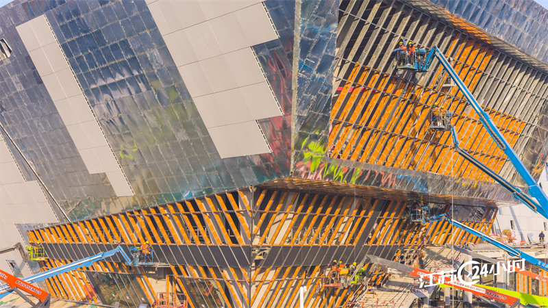 (特约摄影 徐江海 8:15摄 10:05上线)12月25日,工作人员在宿迁市宿豫区顺河街道电商园区商业综合体项目施工现场,给幕墙安装铝型材,加快推进项目建设。