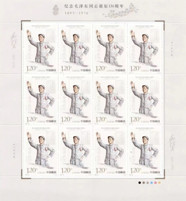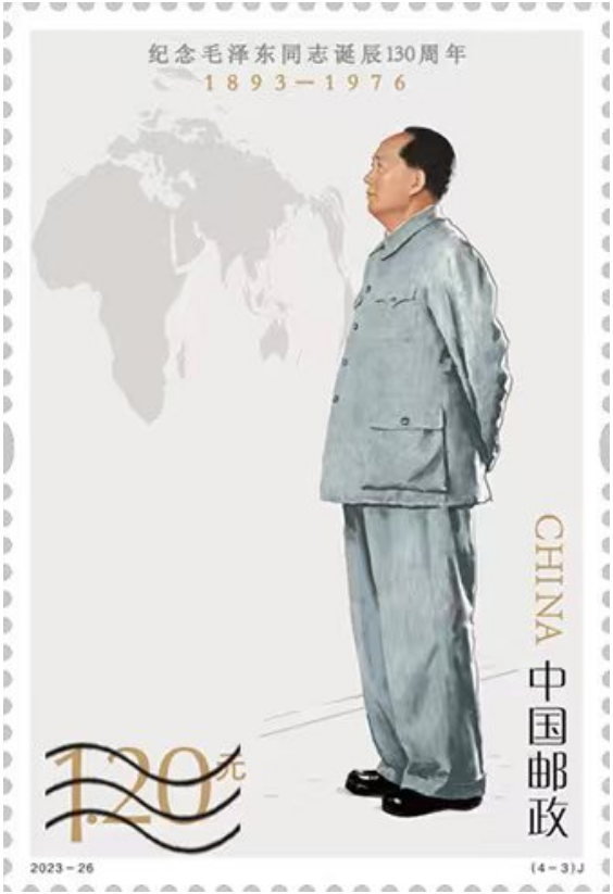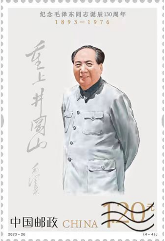 中国邮政定于2023年12月26日发行《纪念毛泽东同志诞辰130周年》纪念邮票1套4枚,邮票图案名称分别为坚持抗战、建设十三陵水库、胸怀天下、重上井冈山。全套邮票面值4.80元。