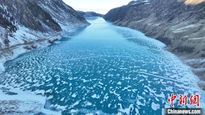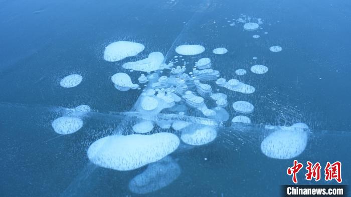 隆冬时节,新疆伊犁哈萨克自治州昭苏县气温持续下降,阿合牙孜大峡谷内的玉湖出现冰泡,冰莲奇观。洁白的冰泡悬于冰层里,而湖面上盛开了朵朵“冰莲花”,在阳光照耀下晶莹剔透,神秘而美丽。冰泡是因气温下降,冰封速度过快,湖底腐殖质在微生物分解作用下释放出的甲烷等大量气体在上升过程中,被“锁”在冰层之中形成的。