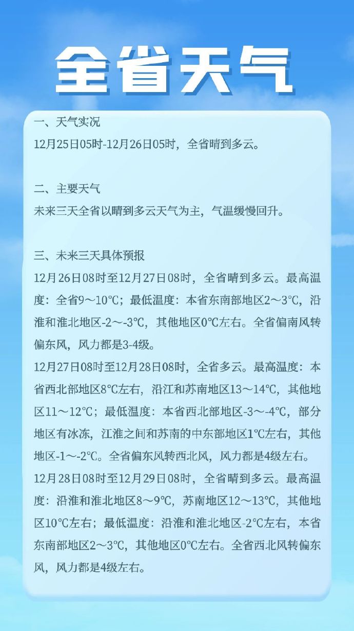 【未来三天全省以晴到多云天气为主,气温缓慢回升】12月26日08时至12月27日08时,全省晴到多云。最高温度:全省9~10℃;最低温度:本省东南部地区2~3℃,沿淮和淮北地区-2~-3℃,其他地区0℃左右。全省偏南风转偏东风,风力都是3-4级。(@江苏气象)