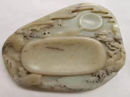 在本次展览众多雅器中,有一方和田玉砚吸引了众多参观者目光,整体呈鹅卵形,圆润优雅,包浆皮壳温润细腻,犹如羊脂,色泽呈青色,精致贵气堪比珠玉之珍。在玉砚中心位置设有砚池,砚池上方雕有手指和圆日,取“指日高升”之意。砚池周围雕饰灵芝、古塔、竹叶、昆虫等,内容丰富,极具观赏性。