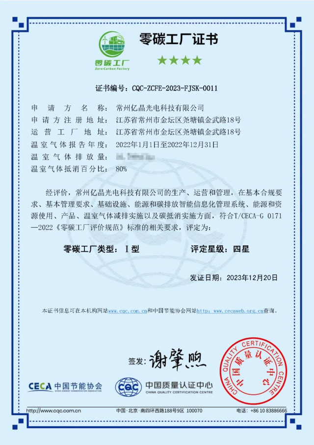 常州亿晶光电获行业首张“零碳证书”
