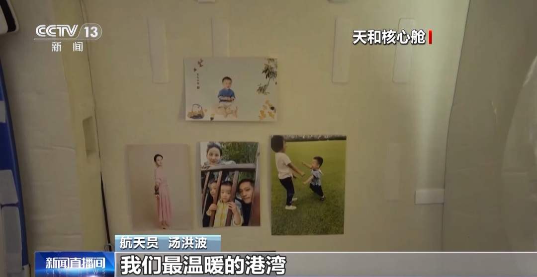 航天员 汤洪波:现在所处的位置是小柱段,就是我们睡觉的地方。这是舷窗,这是睡袋,这是江新林家人们的照片。忙碌一天之余,家人的微笑永远是我们最温暖的港湾。