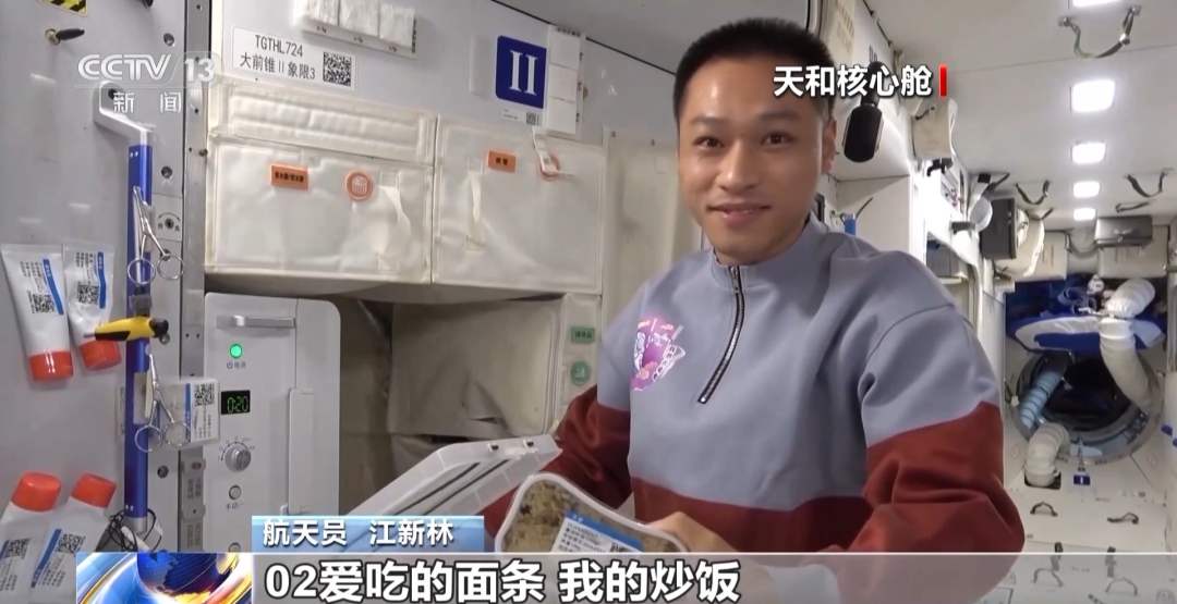 航天员 江新林:我是今天的太空美食家,让我带领大家一起来探索发现今天的太空美食。我们先看一下主食,热乎乎的。有01最爱吃的白米饭,02爱吃的面条,我的炒饭。