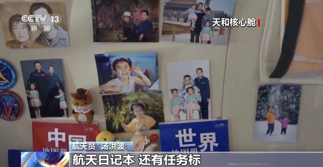 航天员 汤洪波:看一下唐胜杰的睡眠区,比较丰富多彩。家人们的照片、航天日记本,还有任务标、小玩偶。