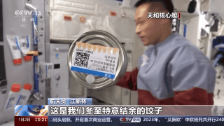 航天员 江新林:再让我们看看我为他们准备的惊喜,这是我们冬至特意结余的饺子,还有蔬菜副食。地面上的工作人员考虑得特别周到,按照个人的口味为我们准备了美味的食品,而且将它们塑封包装,保证口味。