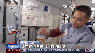 航天员 江新林:这是网红太空香粽,大家印象比较深刻吧,还有这个年糕也特别好吃,特别美味。还有红烩猪排,保证有足够的蛋白质摄入量。
