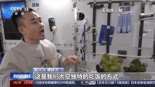 航天员 唐胜杰:今天是新年的第一天,江新杰为我们准备了营养丰盛的太空午餐,但是我觉得我们今天应该再增加一点绿色的新鲜蔬菜,这样午餐就会变得更丰盛了。