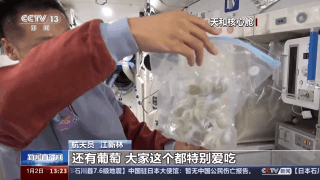 航天员 江新林:我们特意留了一些新鲜的水果,有美味的苹果,还有葡萄,这个大家都特别爱吃,我们三个在一起分享一下。