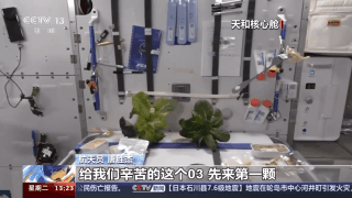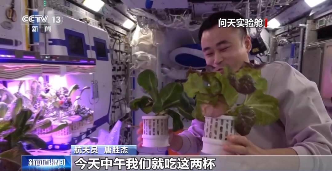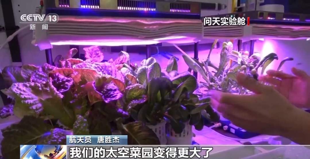航天员 唐胜杰:我正在对樱桃番茄授粉,因为太空没有小蜜蜂,我就是那只小蜜蜂。这是太空蔬菜,我们神十七乘组在太空出差期间,太空菜园变得更大了,大家看看我们的蔬菜是不是长势喜人?