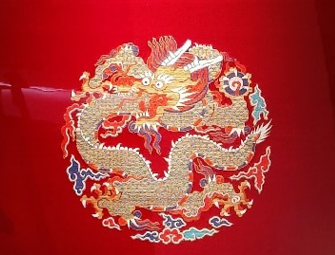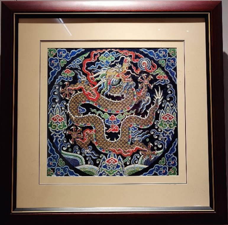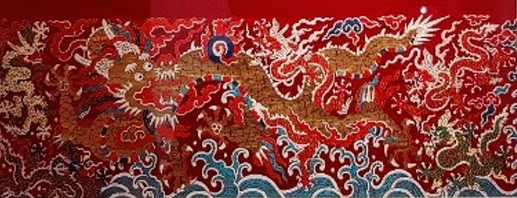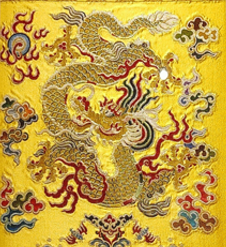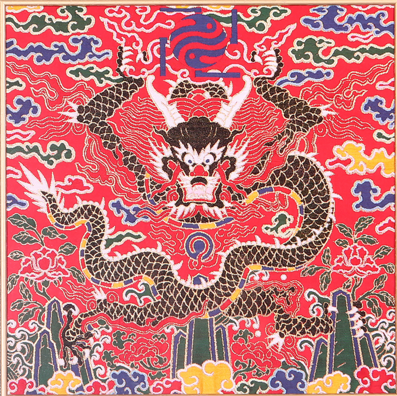正龙纹是龙纹里最尊贵的一种。在《红地正龙方补》作品中,龙身虽然弯曲盘绕,但龙头平视前方,整体呈现出一种威严的仪态,因此成为皇帝庄重森严的象征。