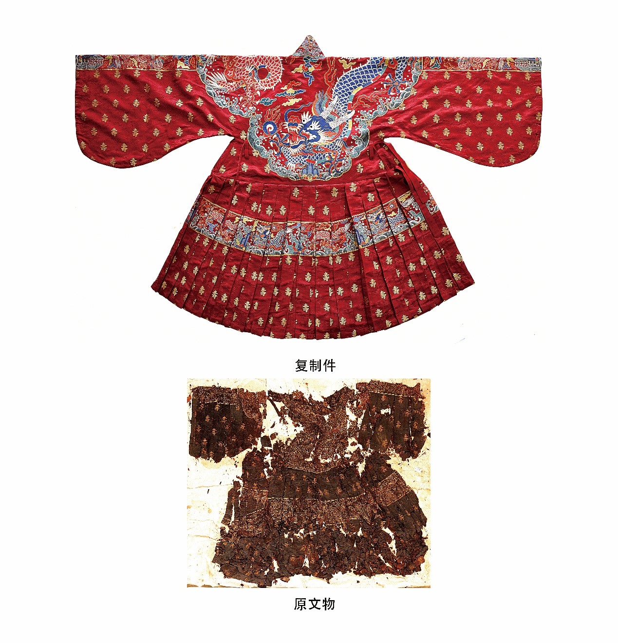 据介绍,1956年至1958年,在北京十三陵定陵万历皇帝的陵墓中,出土了一批罗纱织锦,其中一件为“织金寿字龙云肩通袖龙栏妆花缎衬褶袍”。南京云锦研究所接到复制任务时,这件龙袍早已褪色,腐朽不堪,局部已成碎片。专家们查找了大量古籍文献资料并研读考古报告,历经3年时间,终于按照明定陵出土的原件复制成功。