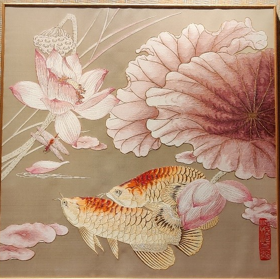 此次展览作品还注重将传统技艺和现代创意相结合,以满足现代观众的审美需求。“比如《金龙献瑞》采用了较为现代的配色,同色系的花与叶更符合当代家装的审美,典雅、柔和,作品中运用到的暗粉色为时尚流行色,金龙鱼鳞片以金线勾勒,更显立体、现代化。”简名伟说。
