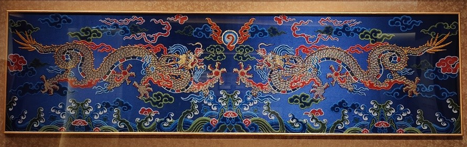 “这件作品以深蓝色底衬托出龙身上真金织造的鳞片,辅以大红色桑蚕丝线织造天火,蓝绿色桑蚕丝线织造祥云海水,恢宏磅礴,极具皇家装饰之美,富有康乾盛世之气。”此次展览策展人、南京云锦博物馆宣传中心主任祖皓说。