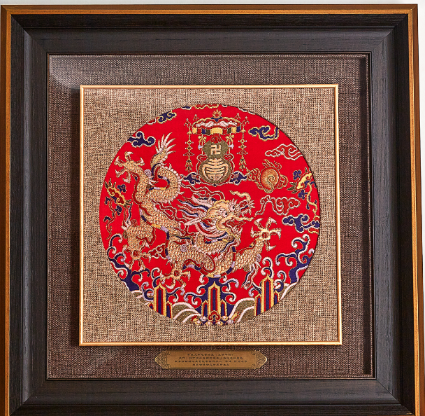 记者看到一件以清朝龙袍复制件为创作灵感的艺术镜框,龙纹的下方波涛汹涌,简名伟解释说:“这是海水纹,主要以波涛翻腾的水浪作为题材,一般在龙纹的下端。山崖纹雄伟巍峨,多为三峰或五峰,通常和海水纹一起出现,统称江崖海水,具有统一江山、万世升平的意义。”