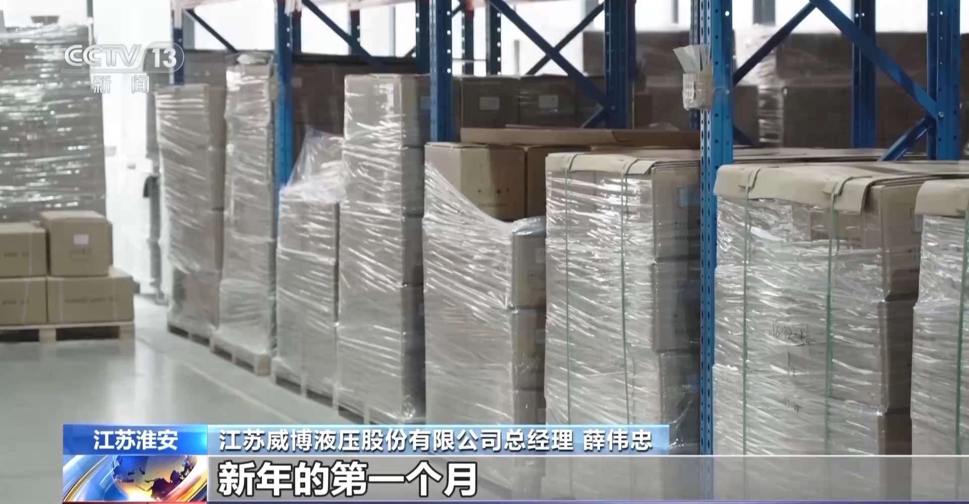 江苏威博液压股份有限公司总经理 薛伟忠:这是发到湖南的,那是发到浙江的。新年的第一个月,我们的订单出现了爆发式的增长。我们现在每天生产2000台套的工程单元,比去年同期增长了40%左右。
