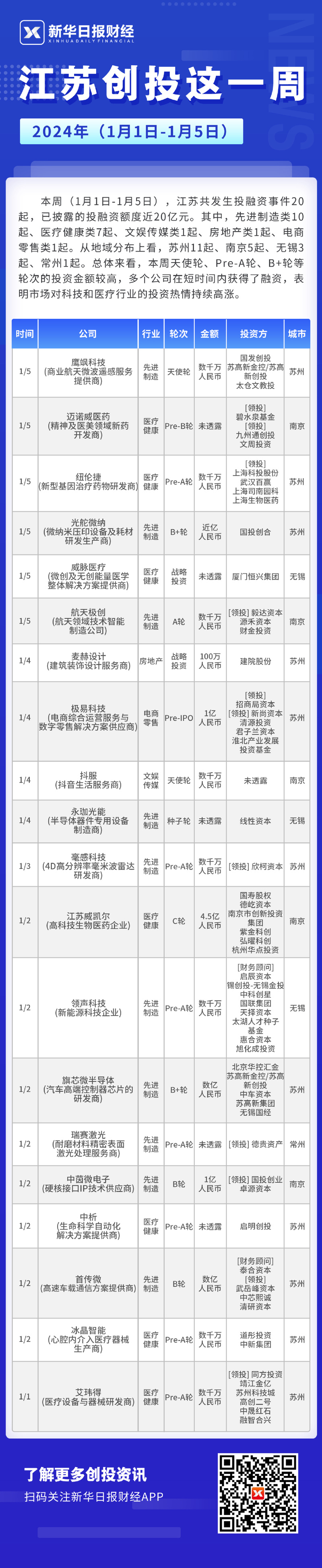 新华日报财经讯 本周(1月1日-1月5日),江苏共发生投融资事件20起,已披露的投融资额度近20亿元。其中,先进制造类10起、医疗健康类7起、文娱传媒类1起、房地产类1起、电商零售类1起。从地域分布上看,苏州11起、南京5起、无锡3起、常州1起。总体来看,本周天使轮、Pre-A 轮、B+轮等轮次的投资金额较高,多个公司在短时间内获得了融资,市场对科技和医疗行业的投资热情持续高涨。