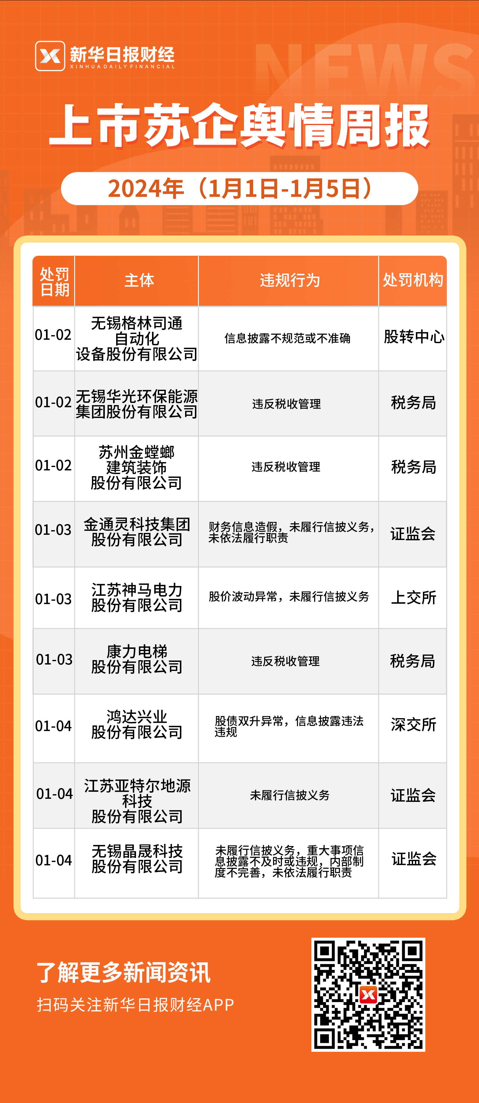 1月3日,公司收到江苏证监局下发的《行政处罚决定书》。经查明,2017年至2022年,公司及其全资子公司通过伪造工程形象进度确认表、发货单等调节EPC总承包项目完工进度(履约进度),虚增营业收入合计11.35亿元,虚增利润总额4.11亿元。期间公司相应年度报告也存在虚假记载。江苏证监局决定,对公司处以150万元罚款;其他四名相关负责人被罚合计420万元。