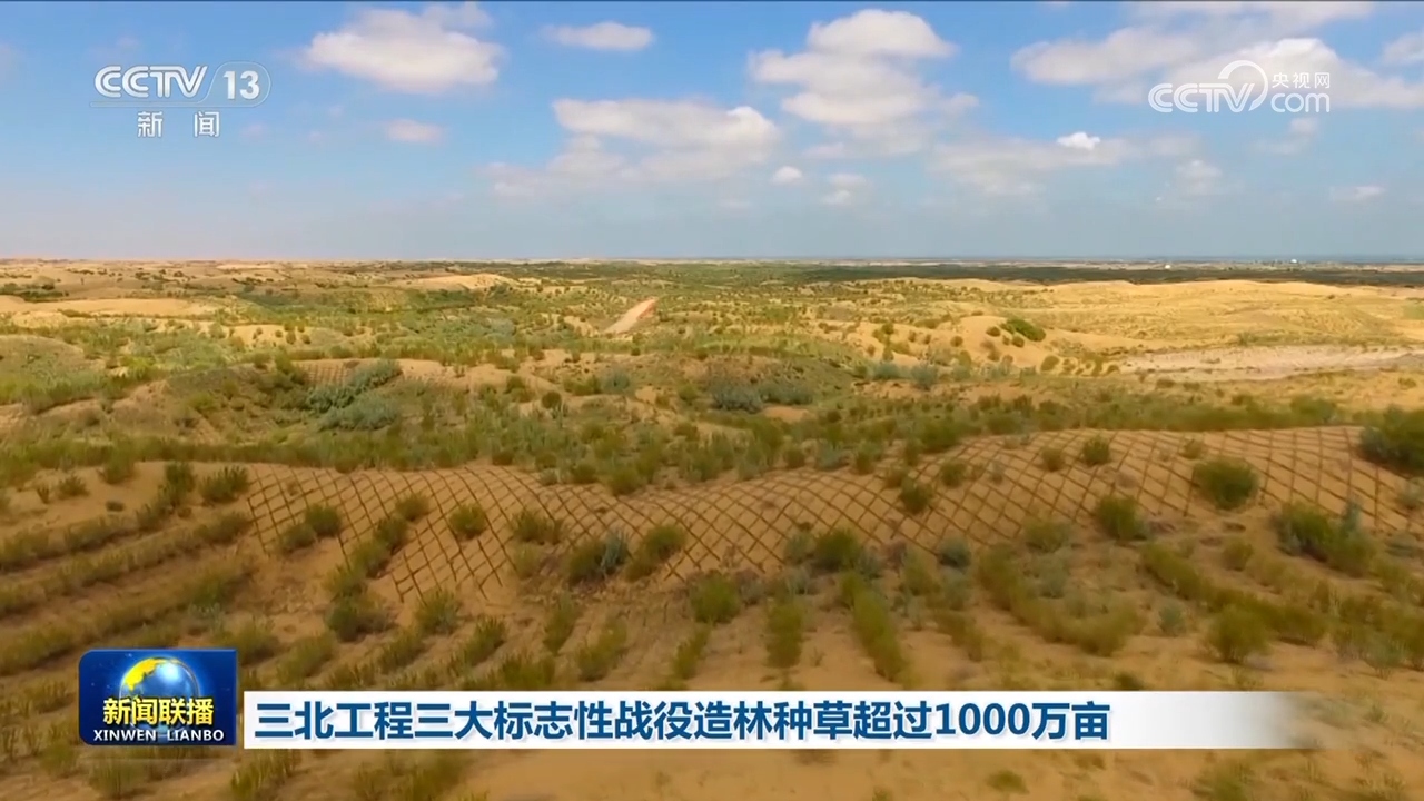 央视网消息(新闻联播):记者从国家林草局了解到,我国三北工程三大标志性战役自2023年下半年启动以来,目前进展顺利,造林种草超过1000万亩。