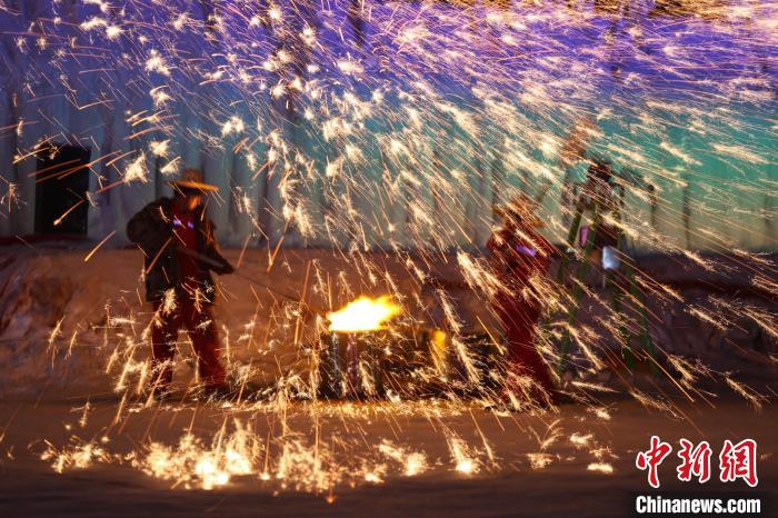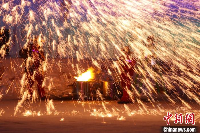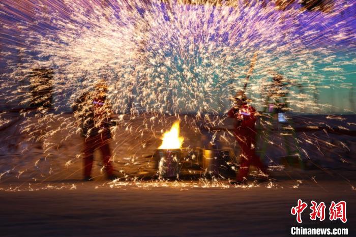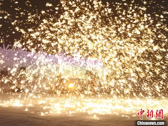 近日,新疆乌鲁木齐市水磨沟区天山明月冰雪城,非遗技艺“打铁花”民俗活动正在上演,为每日前来游玩的游客带来一场场视觉盛宴。“打铁花”是传统的中国经典民俗技艺,比较考验师傅们的功力,师傅们将烧滚烫的铁水打向空中,变成绚丽的烟花。