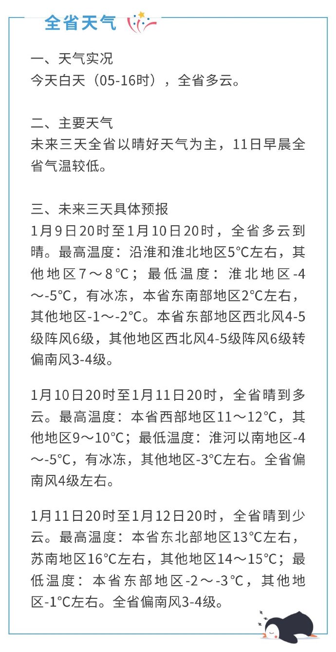 1月10日20时至1月11日20时,全省晴到多云。最高温度:本省西部地区11~12℃,其他地区9~10℃;最低温度:淮河以南地区-4~-5℃,有冰冻,其他地区-3℃左右。全省偏南风4级左右。