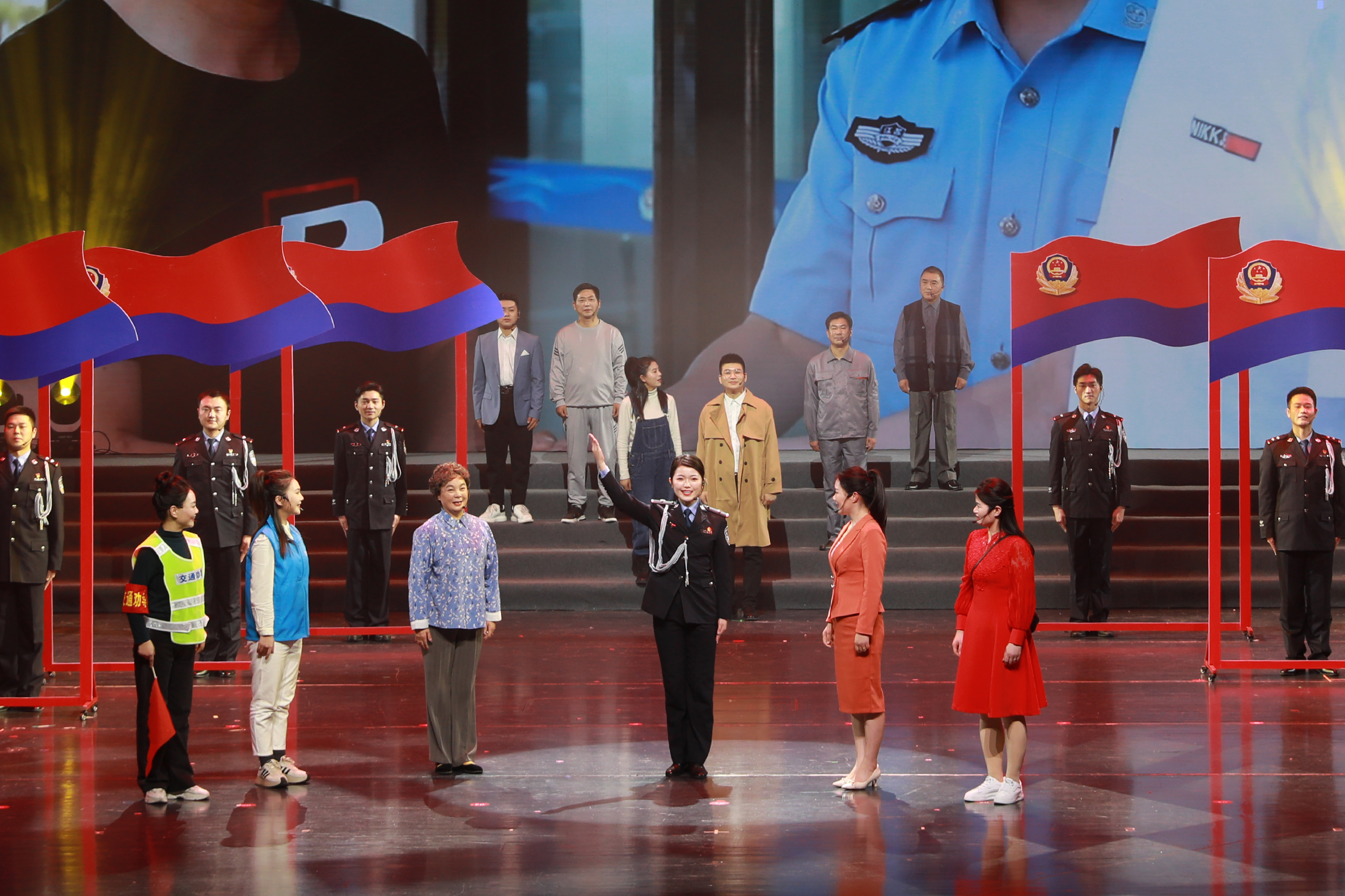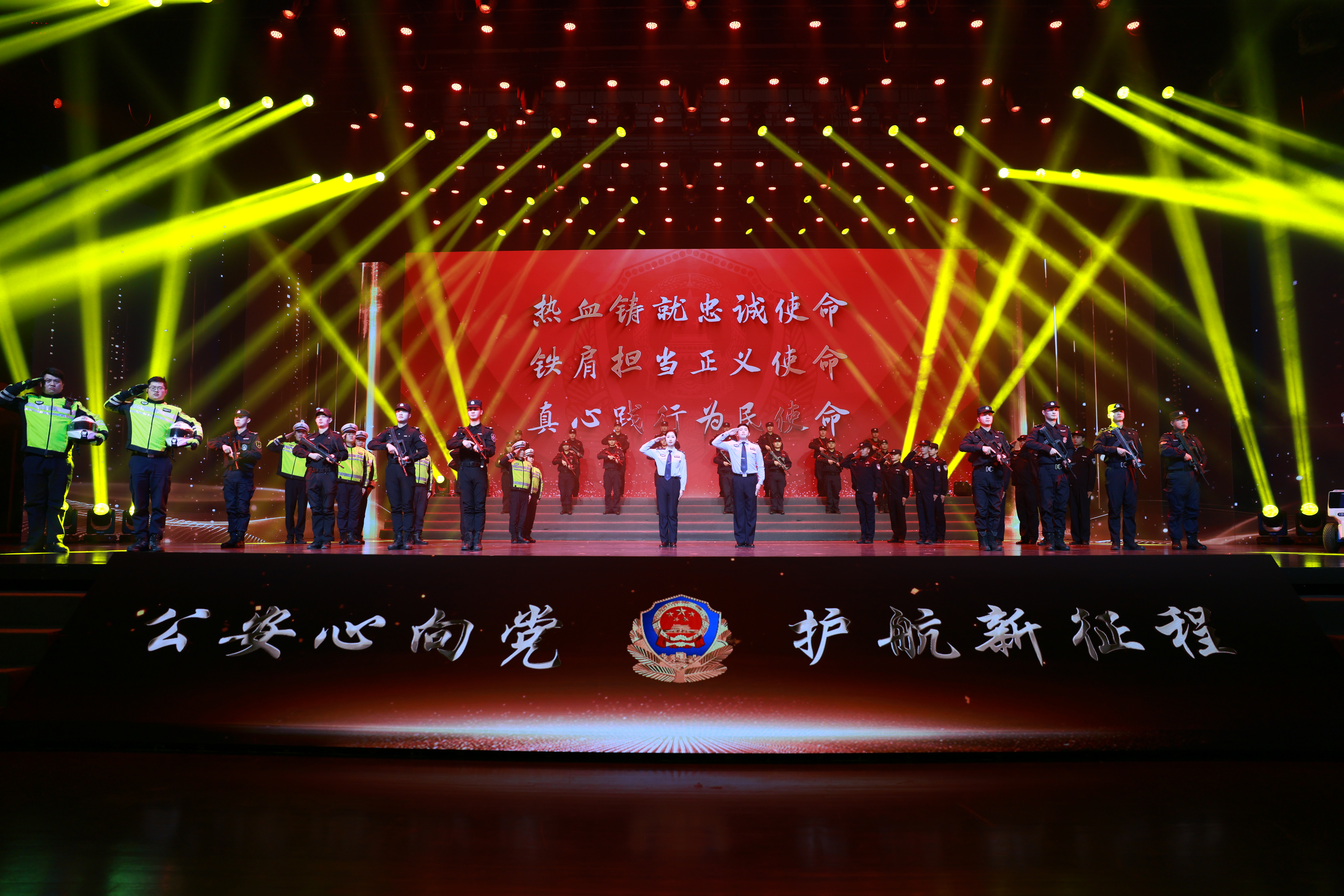 “为了人民幸福,为了复兴理想,风雨兼程,不可阻挡……”歌舞《领航》以旗叙志、以歌抒情、以舞传意,表达了盐城公安坚定不移跟党走的决心信念。